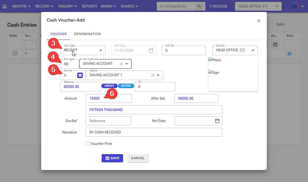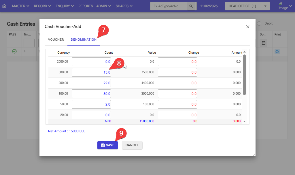 How to deposit money into a savings account and enter the denomination: Follow these steps in the software