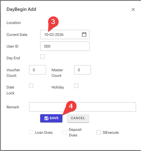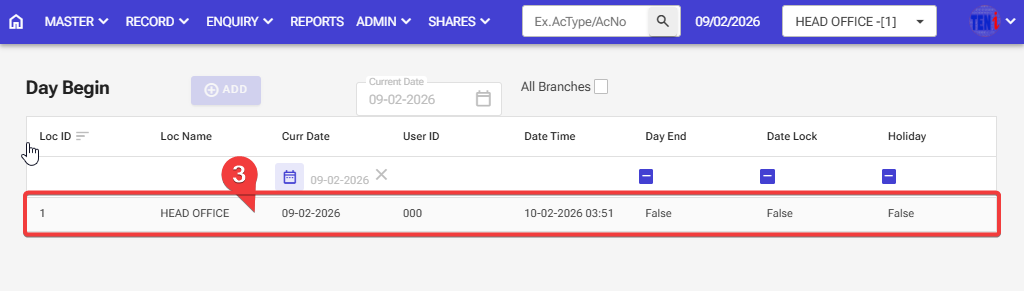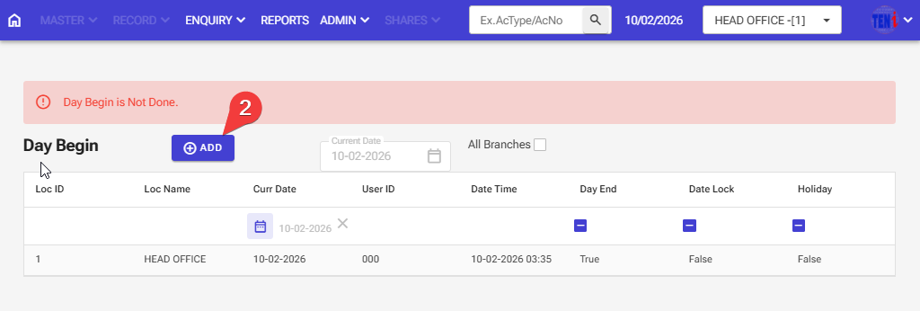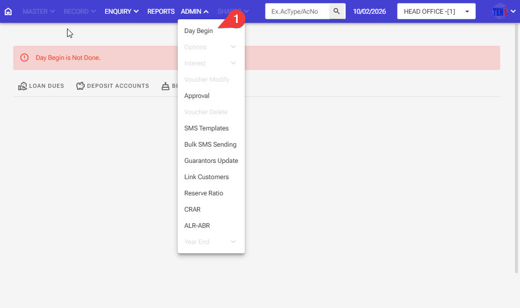 Step 1 Admin > Day Begin > Day Start