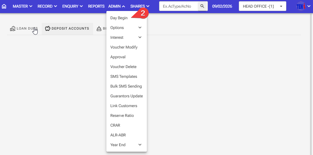 Step 2: Admin > Day Begin
