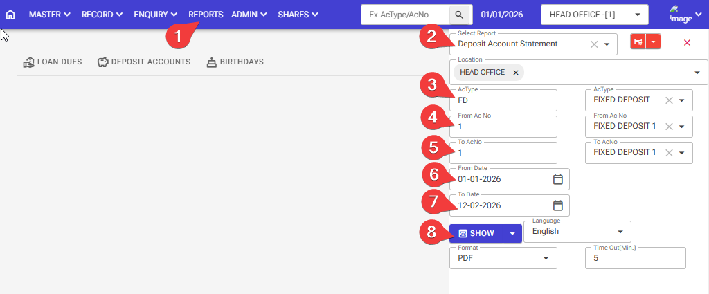 How to check the Deposit Account Statement report: Follow these steps in the software.