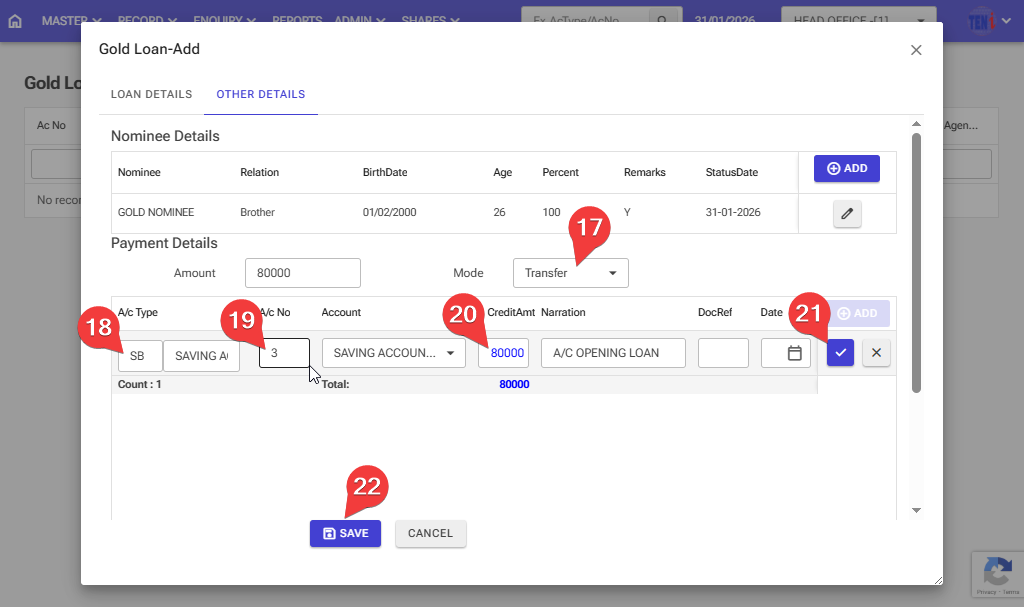 Step 22: After entering all the information, click the ‘Save’ button, and your Gold loan account will be open.