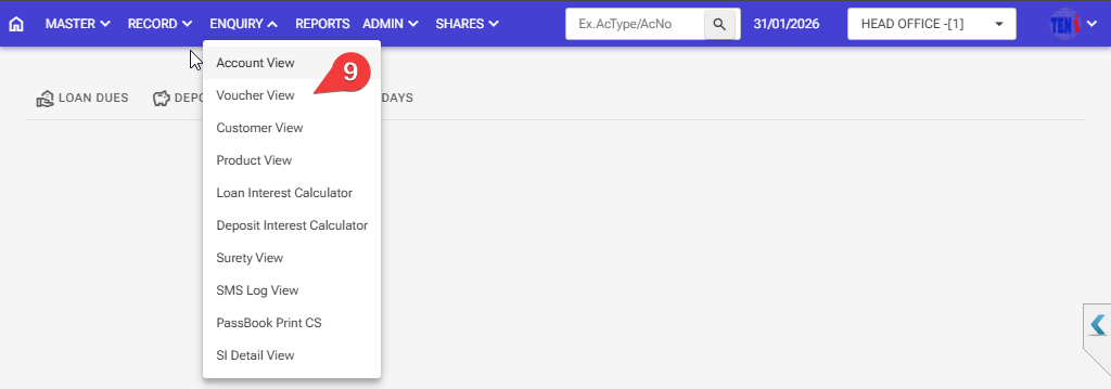 Step 9: How to check if interest has been debited and credited > Enquiry > Voucher view