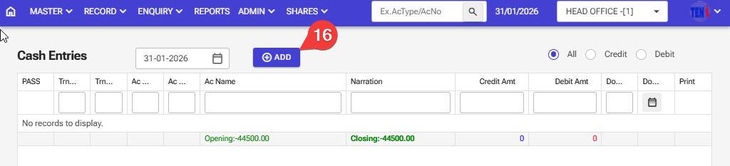 Step 15: Record > Cash Entry