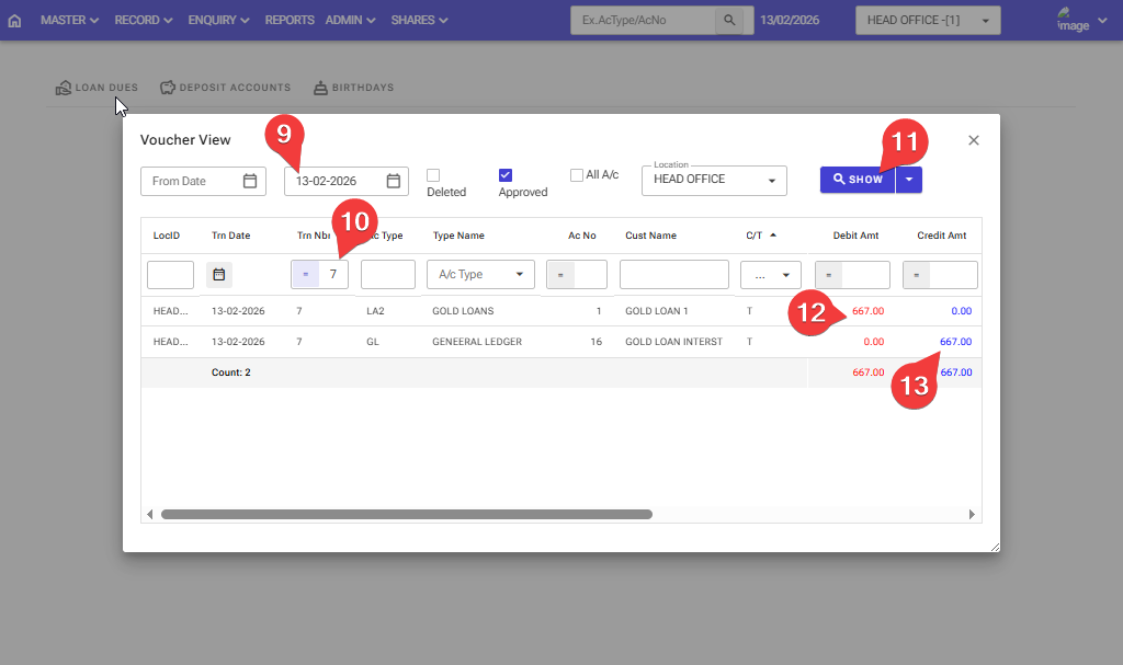 Step 12,13: This entry will debit the Gold Loans account and credit it to the general ledger gold loan interest accounts