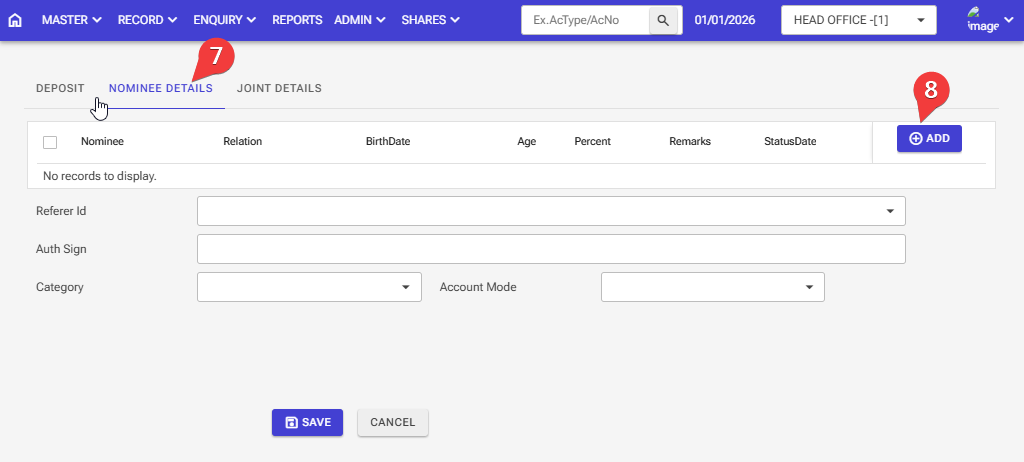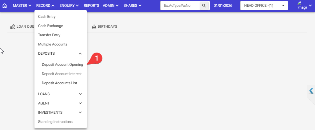 Step :1 Record > Deposits > Deposit Account Opening