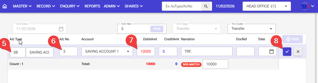 Step 5,6,7:Debit Side. Enter the savings account type, savings account number, and the debit amount enter