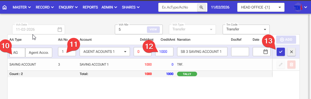 Step 10:11,12: Credit Side. Enter the Agebt account type, Agent account number, and the Credit amount enter